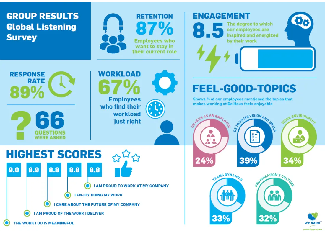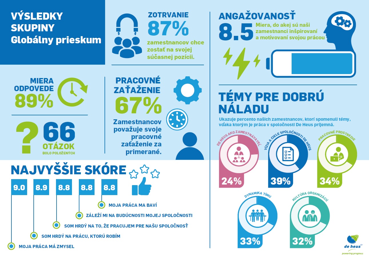 „Veľmi veľa ľudí sa cíti spätých so spoločnosťou De Heus, je hrdých na to, že tu pracujú, a nemajú v úmysle pracovať inde. Naše skóre lojality (Net Promoter Score) bolo tiež veľmi vysoké. Ľudia sa cítia vypočutí, podporovaní a vybavený správnymi nástrojmi pre svoju prácu.“