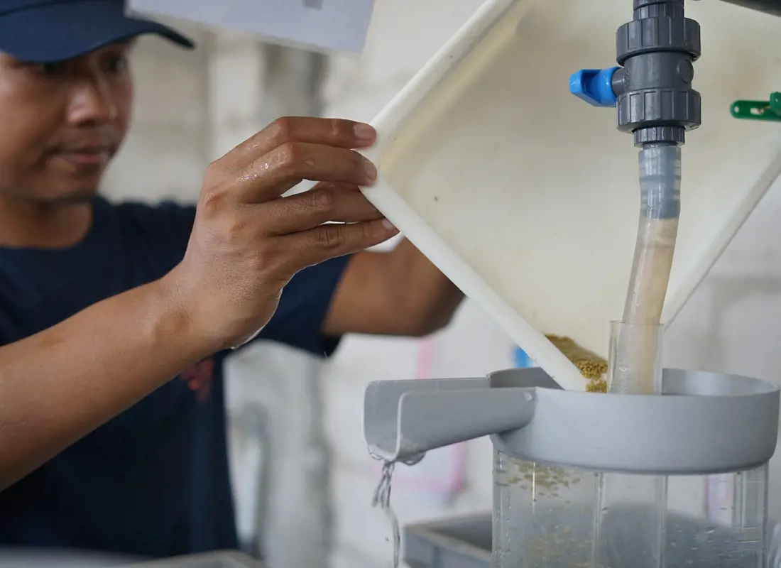 Bettina: "Spoločnosť De Heus nám poskytuje vysokoproteínové krmivo pre vodné živočíchy, ktoré neobsahuje sójový šrot (SBM), ktorý je bežnejší v Európe. Žiadna iná spoločnosť v Indonézii nevyrába toto prispôsobené krmivo a to veľmi prispelo k úspechu projektu. Vo všeobecnosti je pokojne bežné používať SBM v krmivách pre vodné živočíchy, pretože je to ekonomická možnosť. SBM však obsahuje fytoestrogén, ktorý môže počas prvých dvoch týždňov vývoja premeniť samčie plôdiky na samičie. Spoločnosť De Heus Indonesia preto vyrába akvaferment bez SBM, čo prispieva k lepším výsledkom."