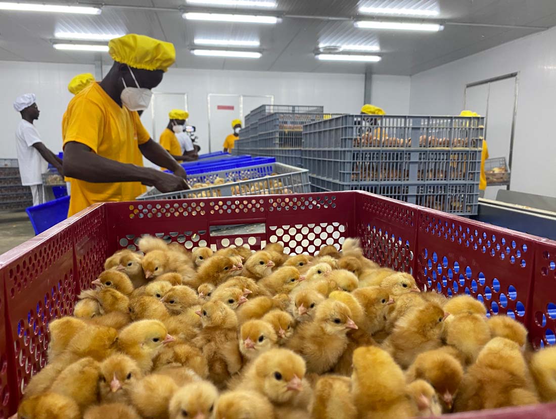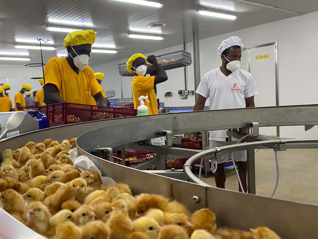 Blížiaci sa príchod továrne na krmivá De Heus umožnil Jurjënovi rozvinúť plány na výrobu jednodňových kurčiat namiesto ich dovozu. "Ak nemáte k dispozícii ľahko dostupné a kvalitné krmivo, chov rodičovských zvierat jednoducho nie je možný," vysvetľuje. "V dôsledku toho sú chovatelia vajec závislí od dovozu jednodňových nosníc. Tieto vtáky sú drahé a ich kvalita je často veľmi neuspokojivá." Spoločnosti Kuipers Breeders a De Heus Ghana sa preto rozhodli spoločne založiť liahňu na produkciu nosníc na miestnej úrovni. Potom však udrela pandémia Covid-19. "Stále sme dovážali jednodňové kurčatá, ale keďže do Ghany neprichádzali žiadne lety, produkcia nosníc a vajec sa zastavila," hovorí Jurjën. "Veľmi som sa obával o dostupnosť potravín v krajine." Theo dodáva: "Covid-19 poukázal na potrebu miestnej produkcie nosníc. Museli sme to urobiť rýchlo."